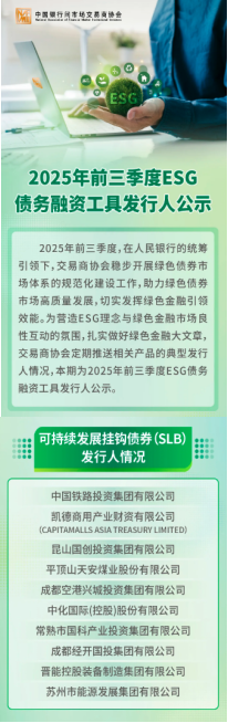 10月22日,中国银行间市场交易商协会(NAFMII)发布《2025年前三季度ESG债务融资工具发行人公示》,投资集团公司位居全国可持续发展挂钩债券(SLB)发行人情况榜首,交易商协会给予充分肯定。北京金融资产交易所对投资集团公司通过铁路金融工具创新,资本市场赋能铁路高质量发展给予专题宣传。